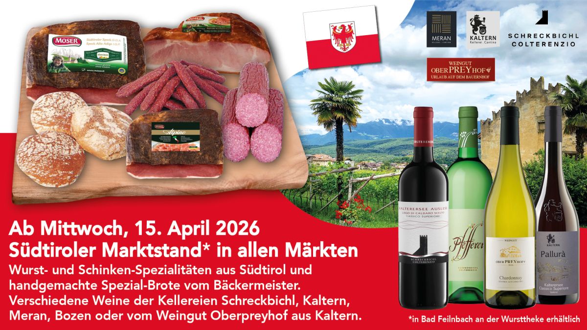 Ab Montag, 13. April 2026 findest Du bereits eine schöne Auswahl an Südtiroler Weinen der Kellereien Schreckbichl, Kaltern, Meran und vom Weingut Oberpreyhof aus Kaltern in unseren Märkten.